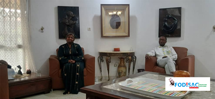 Les émissaires de la FODISAC ont été reçus par Hadja Mariama ARIBOT, entourée de son époux, M. Alain Guy TANEFO et Mme Mariama CAMARA. El Oumar CAMARA a présenté les activités de la FODISAC, notamment l’Exposition en préparation, tandis que la Présidente a exprimé la satisfaction de la délégation. Le Secrétaire général a ensuite présenté les dix noix de colas d’usage, sollicitant Hadja Mariama ARIBOT pour être la marraine de l’Exposition, initialement prévue le 1er février 2026 et reportée au 28 mars 2026.